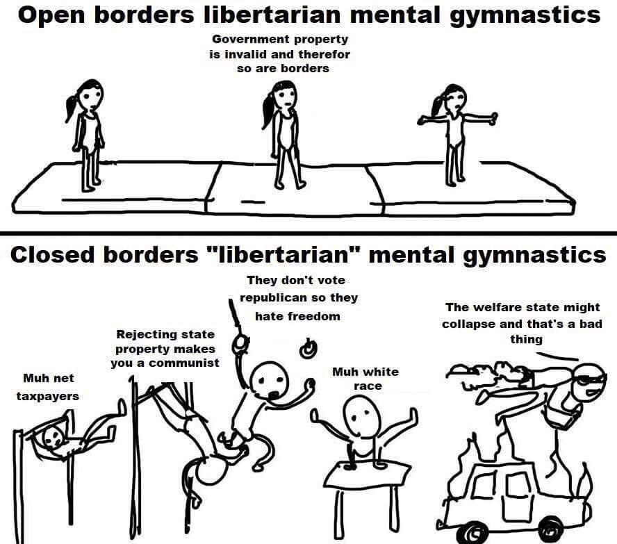I find it hard to reconcile libertarian principles with closed borders. I don’t know how y’all do it! I guess I’m not quite the mental gymnast that y’all are. But, one of the best arguments that I’ve heard: Property owners can decide hwho is allowed on their property. Since we (unfortunately) still have a government, the government owns public infrastructure such as roads, airports, etc. and Citizens own the government. And Citizens have voted for Trump. They’ve voted to not allow illegal immigrants to use our public infrastructure. You may let in hwhomever you want to your own home, but they can’t use the government’s roads to get there.